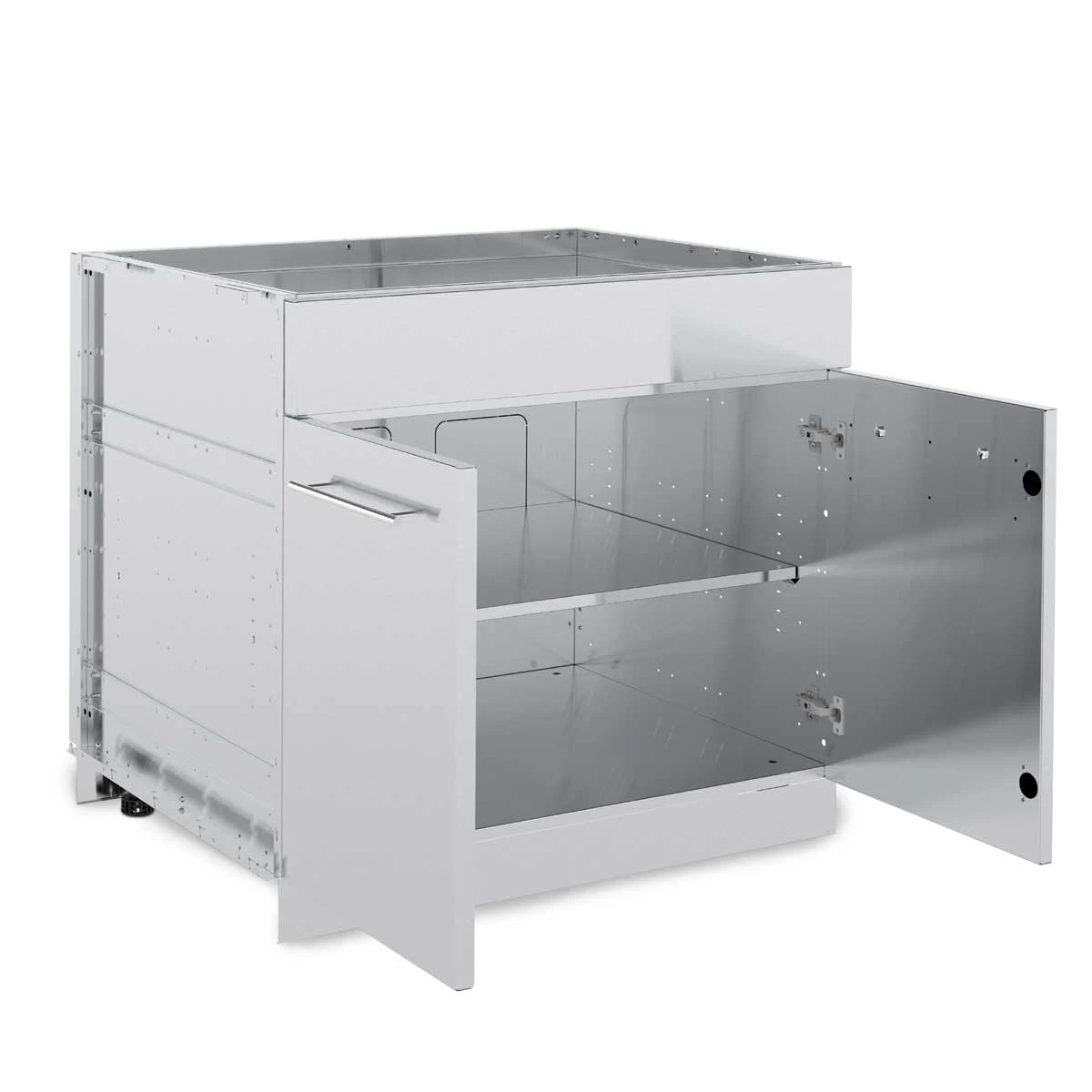 In dem großen Cabinet Schrank bringt Ihr alles unter, was Ihr bei der Vor- und Zubereitung Eurer Grillzutaten zur Hand haben müsst. Der bietet reichlich Stauraum für Zutaten, Geschirr, Besteck, Saucen und Gewürze sowie Unterbringungsmöglichkeiten für vielfältiges Grillzubehör. Aus und mit massiven höhenverstellbaren Füßen ist das Schrankmodul äußerst hochwertig und stabil. Es wird bereits voll montiert geliefert, so dass einem problemlosen Aufbau nichts im Wege steht.