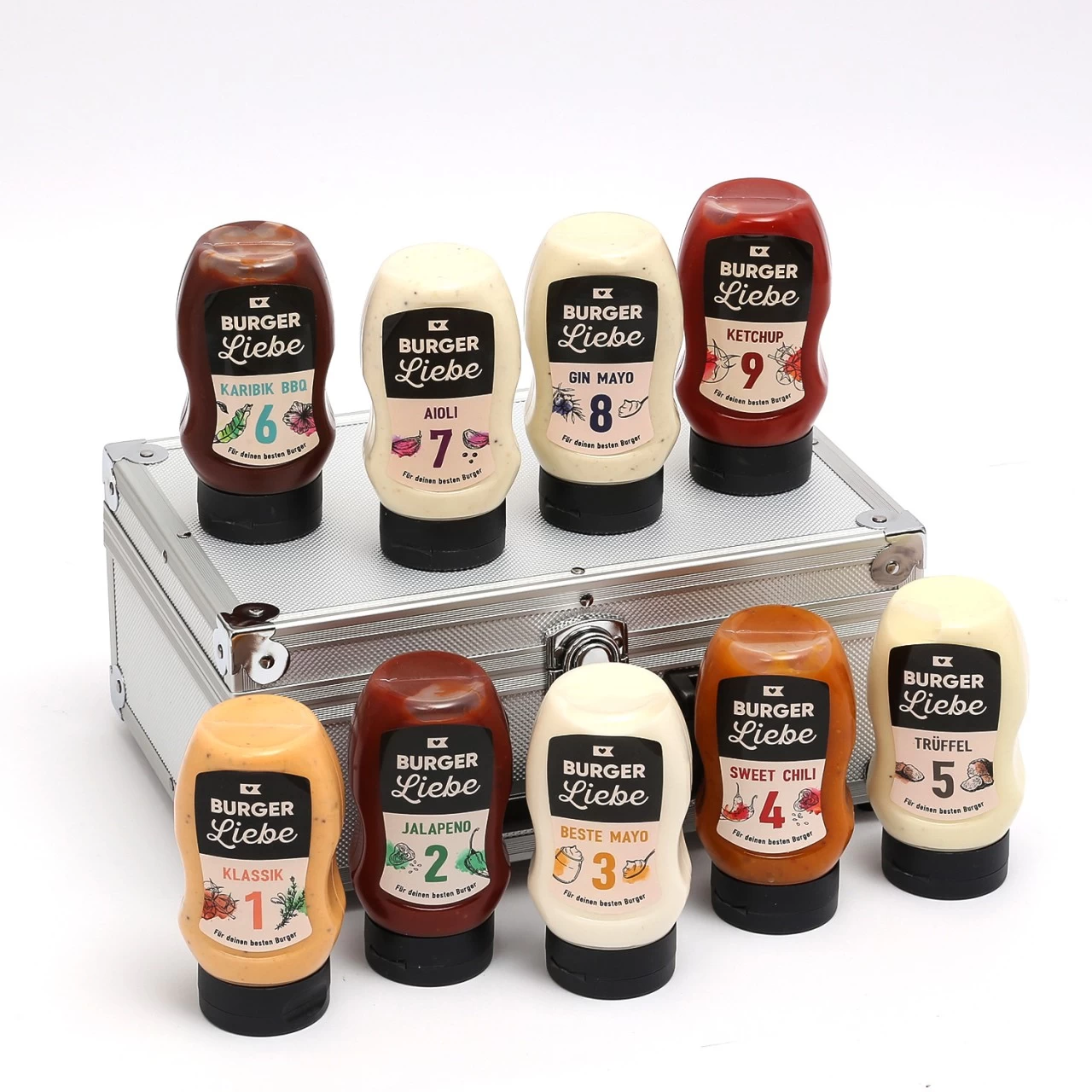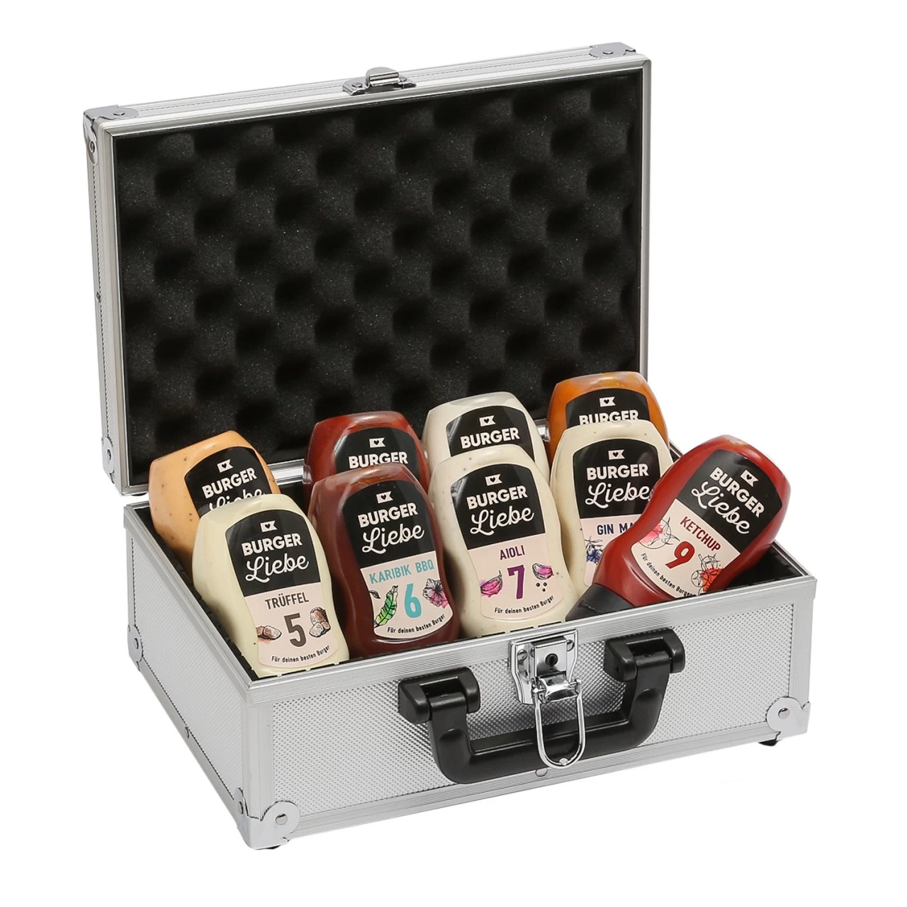 BURGER LIEBE – Geschenkset mit 9 Burgersaucen – Inkl. Transportkoffer