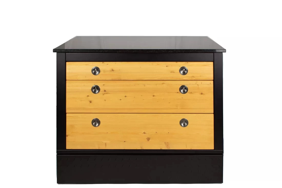 Das Outdoor Modul mit drei Schubladen von Merklinger ist sehr praktisch und bietet viel Stauraum. Mit einer Arbeitsfläche aus Granit, Holzteilen aus Lärchen, einem Rahmen aus pulverbeschichtetem Stahl, Vollgummirädern und einer Feststellbremse ist das Modul sehr robust und hochwertig.