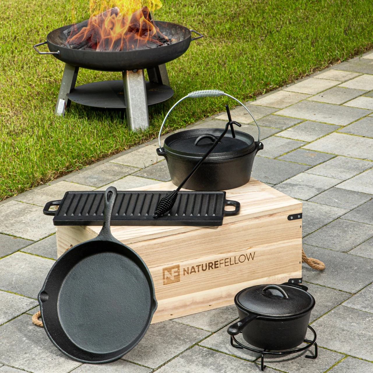 Dieses Dutch Oven Komplettset ist eine perfekte Ausstattung für alle, die gerne mit Gusseisen kochen. Das Set umfasst 2 Topfe, 1 Pfanne und eine Grillplatte. So ist man auch alle Rezepte gut vorbereitet.