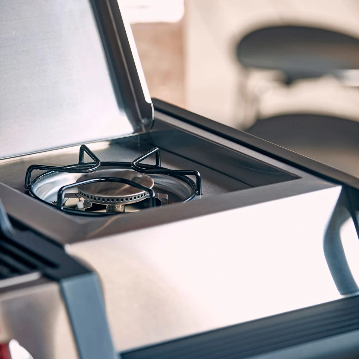 Auf der könnt Ihr Steaks und Co mit ordentlich Röstaromen und fetten Krusten veredeln. Hier sorgt ein frei regulierbarer 4,2 kW-Brenner für Extra-Power, das spezielle Mesh-Gewebe der Brennerabdeckung heizt zusätzlich mit Infrarot-Hitze ein.