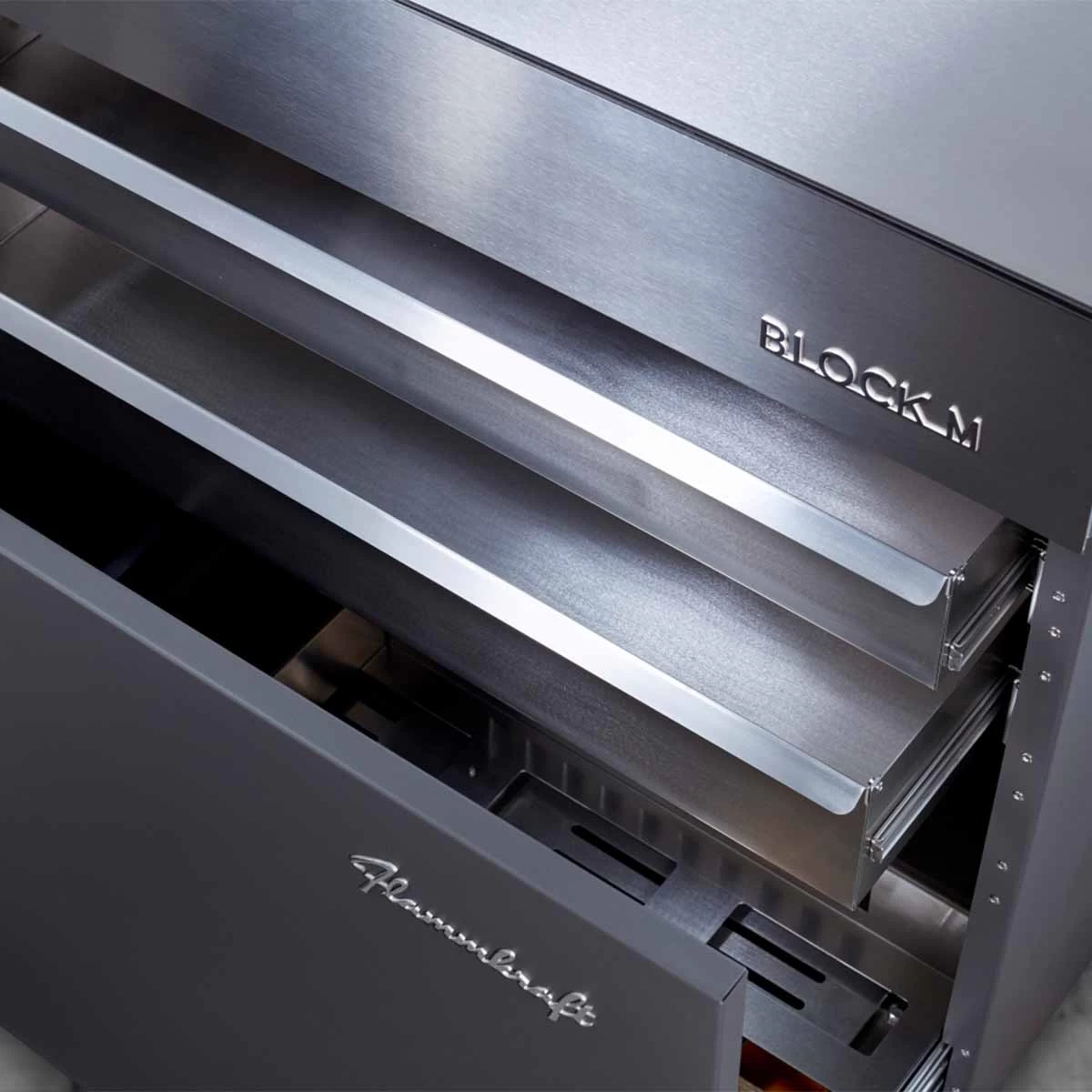 Der Block M ist ein aus 100% Edelstahl, in der Grundfläche entspricht er dem Block D und ist in den gleichen Farben erhältlich. Neben umfangreichen für Zubehör bietet der Block M einen Abfallbehälter und eine komfortable Lösung für die Vorbereitung und Bereitstellung von Zutaten.