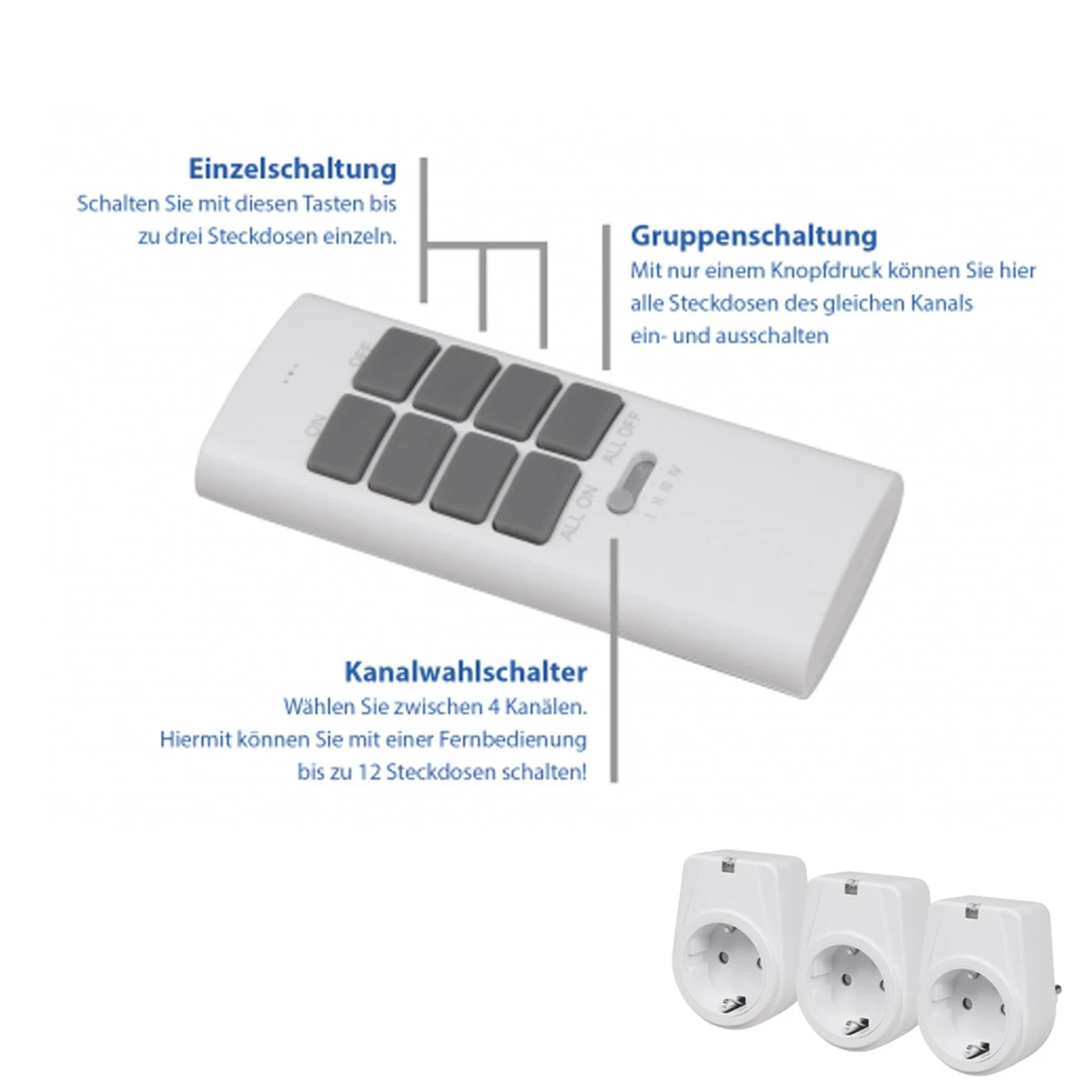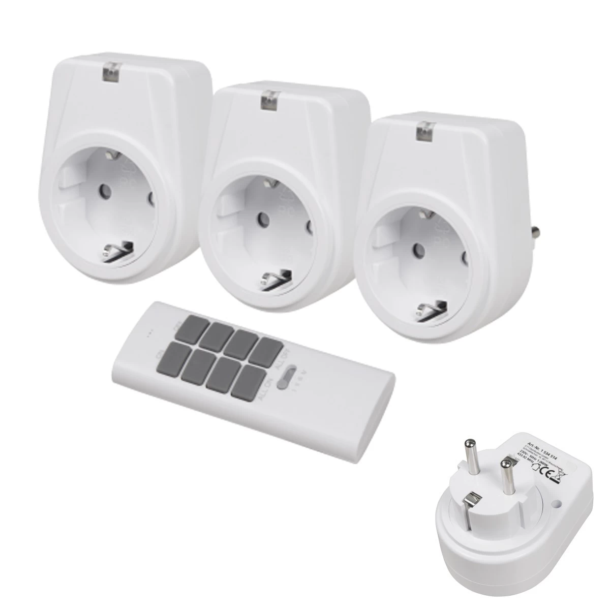 Das Set besteht aus drei Steckdosen für Schutzkontaktstecker oder Eurostecker sowie einer Funk-Fernbedienung. Die Fernbedienung kann insgesamt 4 Zonen mit je 3 Steckdosen, also 12 Verbraucher schalten.