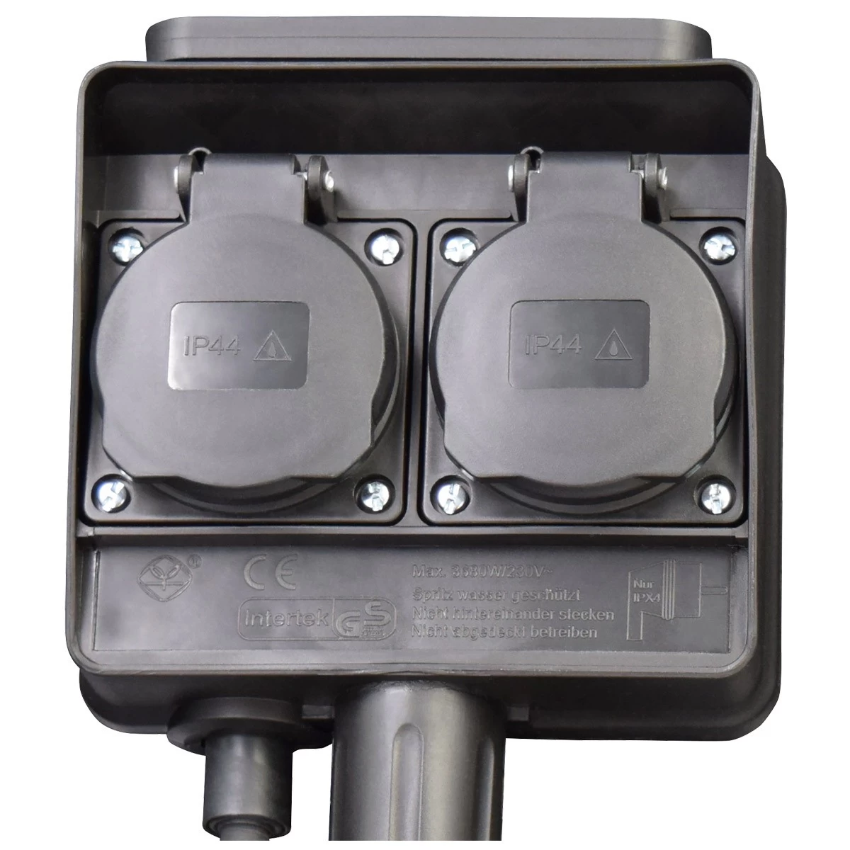 Die Stabile Steckdose besteht aus bruchsicherem Kunststoff. Das Gehäuse ist spritzwasserfest abgedichtet (Schutzklasse IP44).
