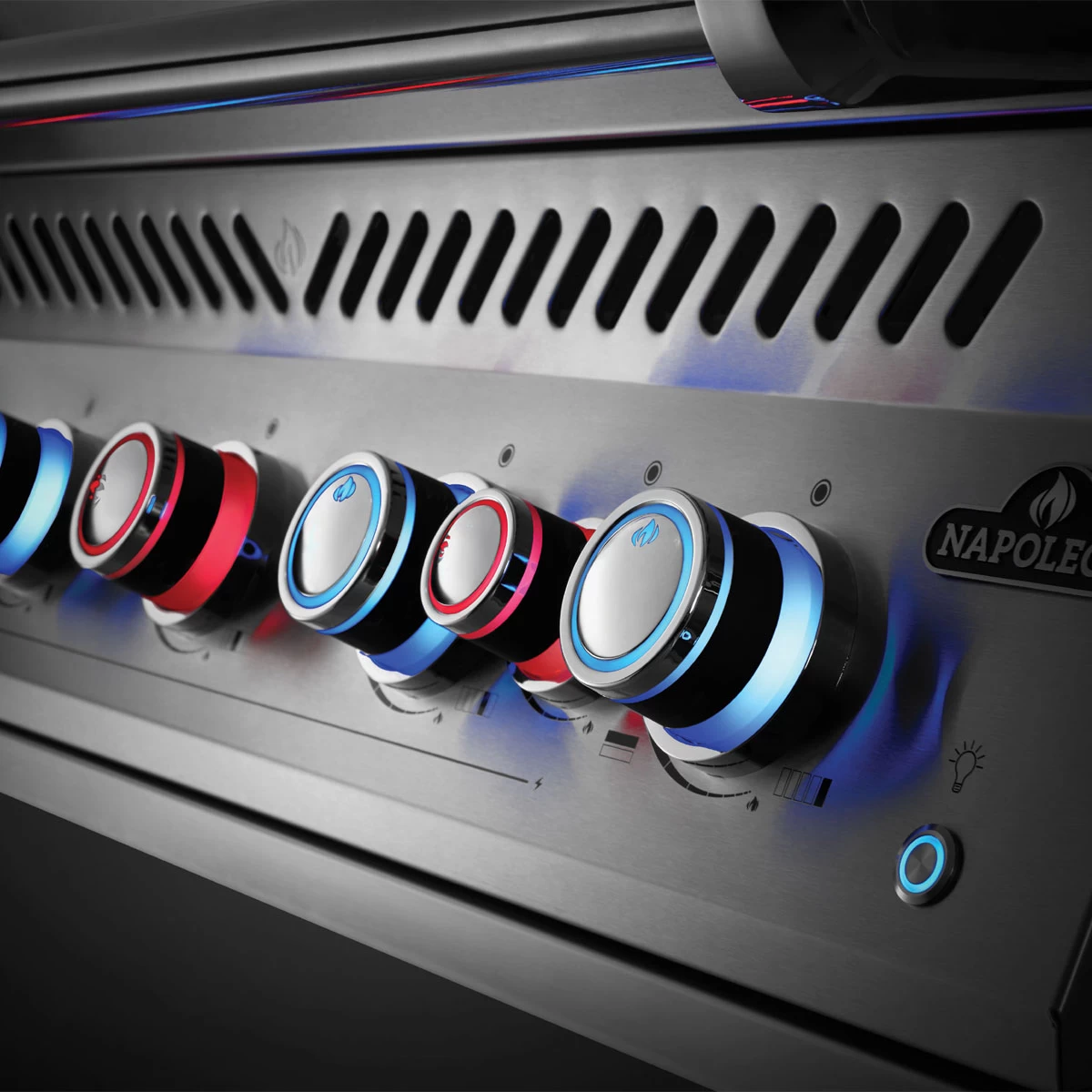 Selbst in der Dunkelheit lässt sich dieser Grill dank integrierter Drehgriff-Beleuchtung präzise steuern. Die Beleuchtung ändert sich bei Gasfluss von blau zu rot, so dass Ihr mit einem Blick erkennen könnt, welche Brenner gezündet sind.