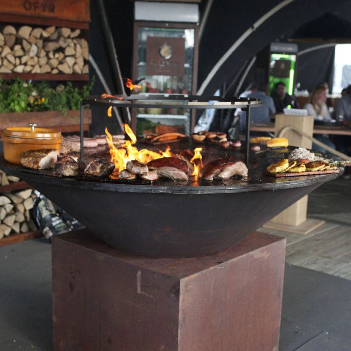 Die OFYR Feuerplatte verfügt mit einem Grillplatten-Durchmesser von 150 cm über eine , auf der zwei Köche gleichzeitig bis zu 150 Personen bewirten können. Die garantiert optimale Hitzeverteilung mit verschiedenen Temperaturzonen von 200°C am äußeren Rand bis 300°C am inneren Rand. So kann je nach Bedarf Fleisch scharf angebraten, Gemüse und Fisch gedünstet sowie fertige Speisen warmgehalten werden – und das alles gleichzeitig.