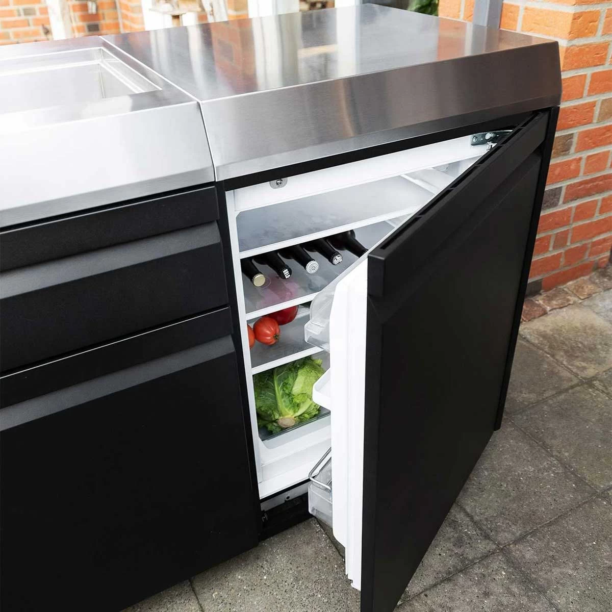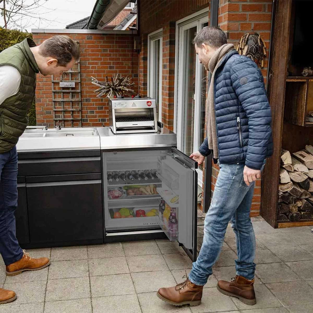 Mit einem wird das Außenküchen-Leben einfach noch cooler. So habt Ihr kalte Getränke und frische Zutaten in Grill-Reichweite, ohne umständliche Wege in die Indoor-Küche unternehmen zu müssen. Zusätzlich erhaltet Ihr wertvolle Arbeitsfläche, auf der Ihr das Grillgut vorbereiten und anrichten könnt. Massiver Edelstahl, schwarz pulverbeschichtete Oberflächen sowie eine sehr hochwertige Verarbeitung sorgen für Qualität und Langlebigkeit.