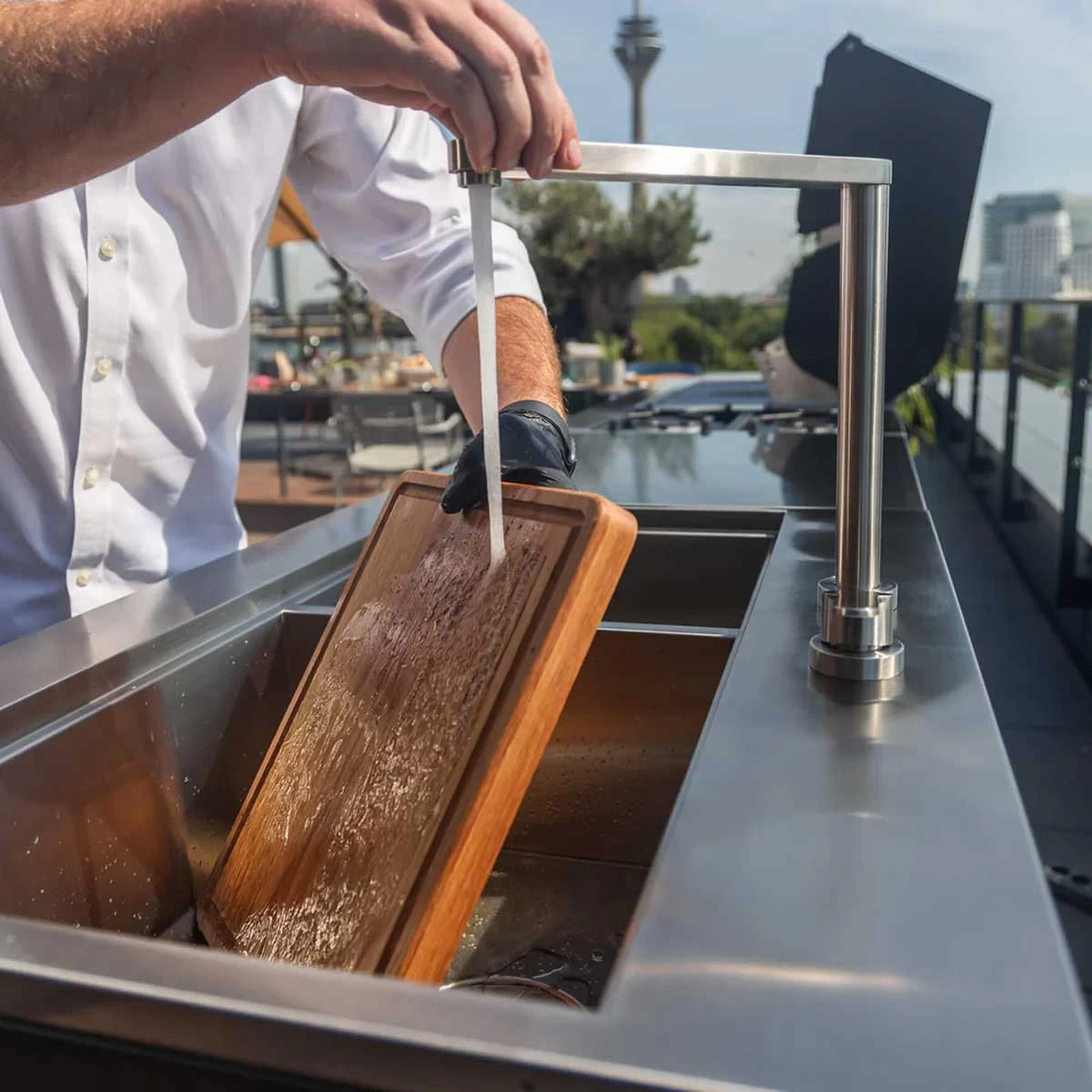 Das Modul mit integrierter Spüle macht Eure Otto Wilde Plattform Außenküche komplett. Kein umständliches Gerenne mehr in die Küche, um Grillzubehör und Schneidebrett abzuwaschen – dafür mehr Zeit für nette Gespräche in direkter Nähe zum Grill. Das Plattform , so dass Ihr für jeden Wasserbedarf gerüstet seid – ob Abwasch, Essenszubereitung, Salat putzen oder Händewaschen. Das Waschbecken in der Grillecke ist nicht nur ungeheuer praktisch, sondern passt mit seinem markant eckigen Design perfekt zum geradlinigen Stil der gesamten Plattform Outdoorkitchen-Se