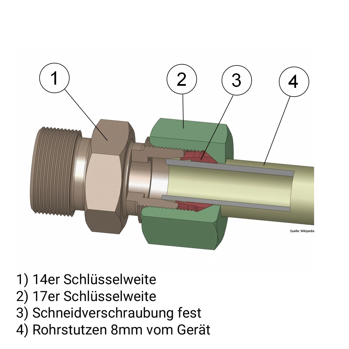 Die Kochstelle eignet sich dank 8mm Stutzenanschluss sowohl als Campingkocher als auch als Küchenkocher. Der Anschluss erfolgt mit handelsüblichen Rohrverschraubungen (siehe Zubehör).