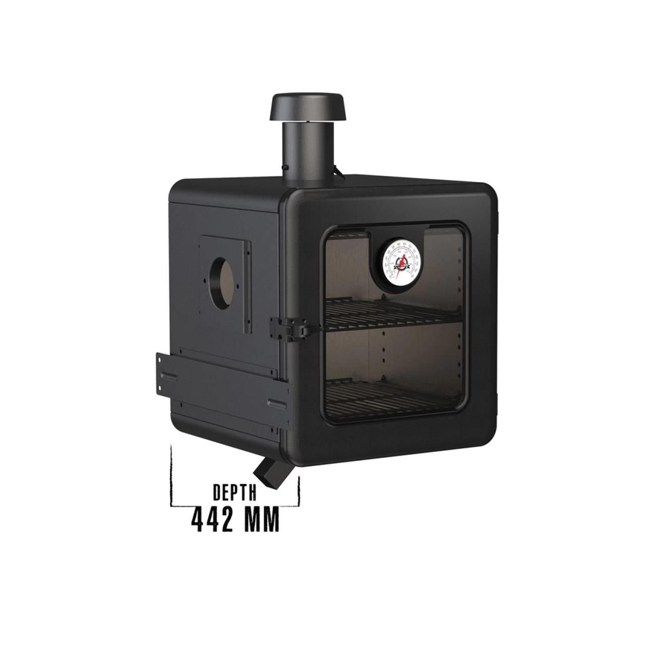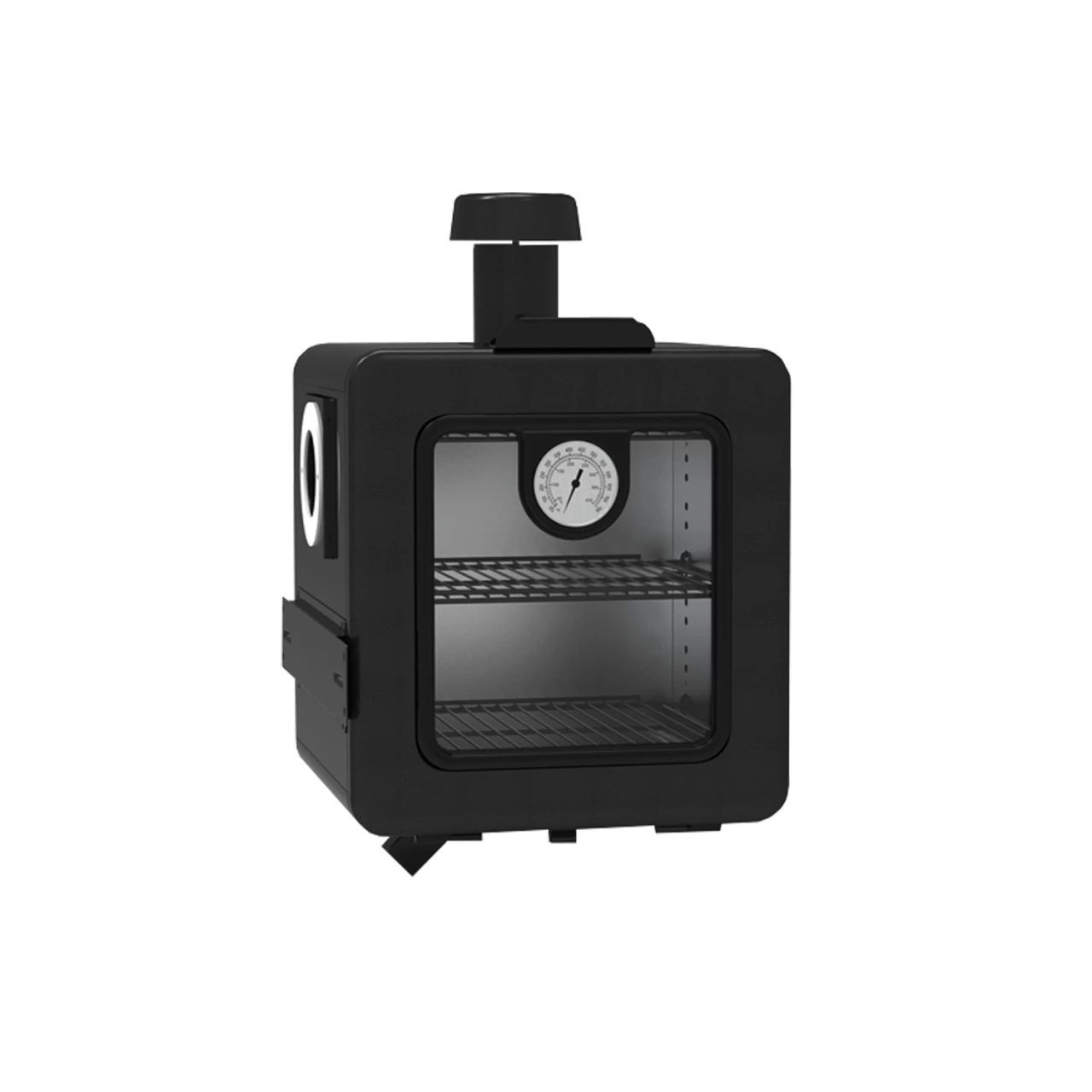 Durch das große Sichtfenster hast Du Deine Rauchprodukte stets im Griff und der in der Scheibe eingesetzte Thermometer gibt dir zu jeder Zeit die Aktuelle Innenraumtemperatur an.