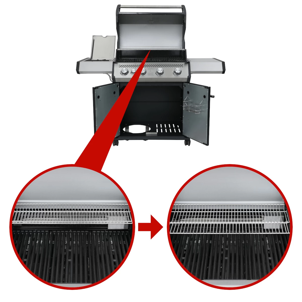 Die Seitenablagen verfügen über Haken, an denen Ihr das Grillzubehör wie z.B. oder aufhängen könnt. Zusätzlich ist die rechte Seitenablage durch einfaches Heben nach unten weg klappbar. Damit schafft Ihr schnell Platz und der Grill kann einfacher positioniert oder verstaut werden.
