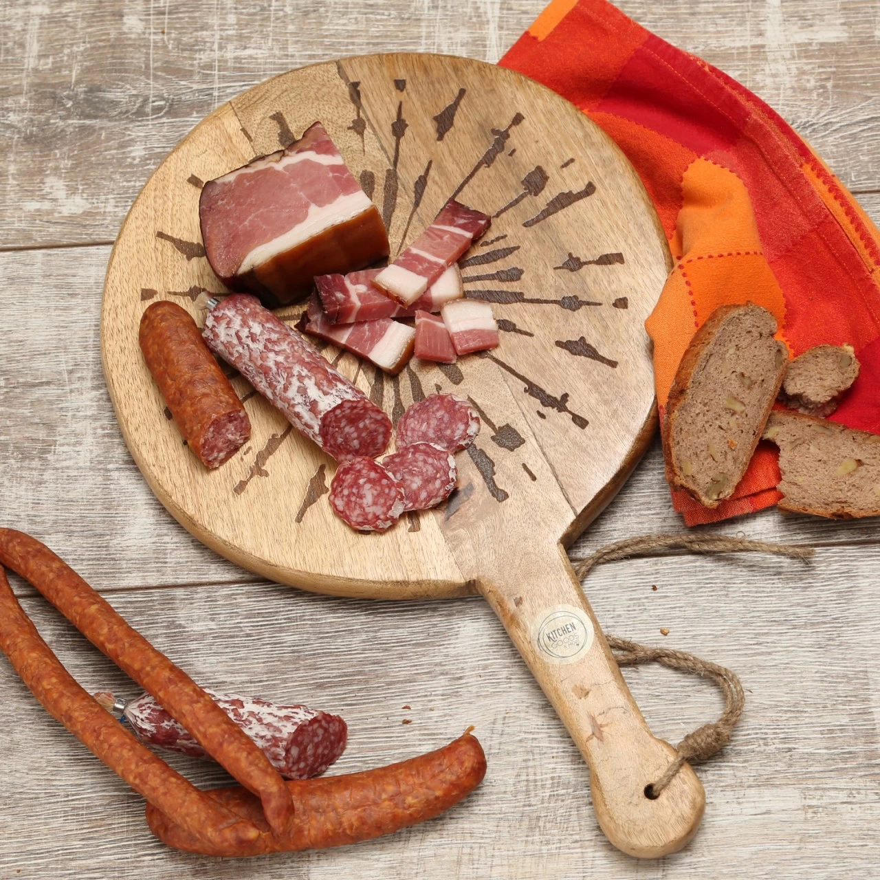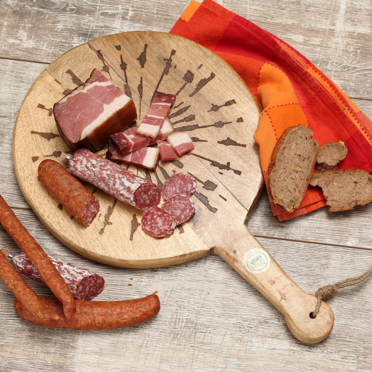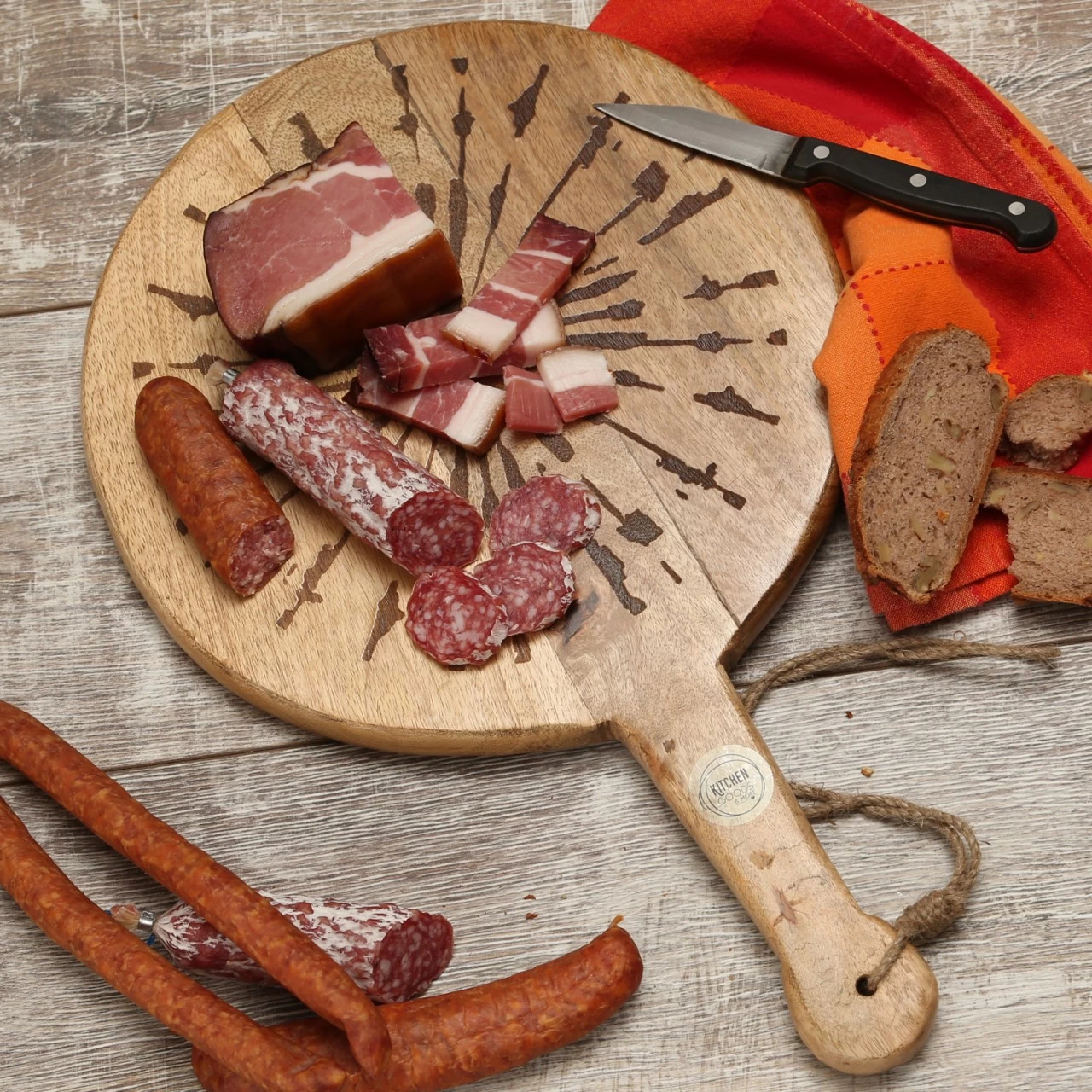 Mangoholz ist besonders hart. Dadurch bilden sich weniger Rillen beim Schneidevorgang. Und weniger Rillen bedeutet auch weniger Ansammlung von Keimen und Bakterien. Somit sind Schneidebretter aus Mangoholz bestens für die Küche geeignet.