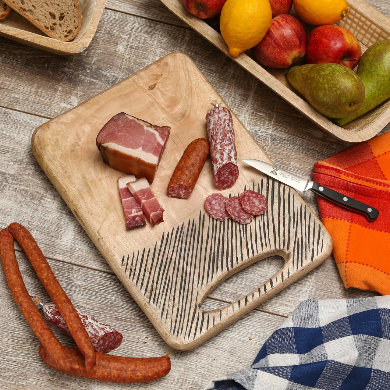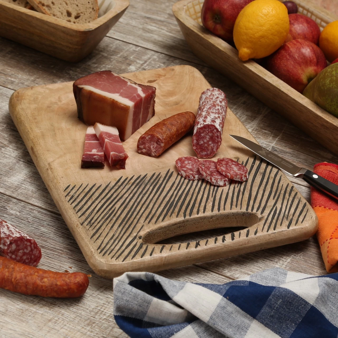 Mangoholz ist besonders hart. Dadurch bilden sich weniger Rillen beim Schneidevorgang. Und weniger Rillen bedeutet auch weniger Ansammlung von Keimen und Bakterien. Somit sind Schneidebretter aus Mangoholz bestens für die Küche geeignet.