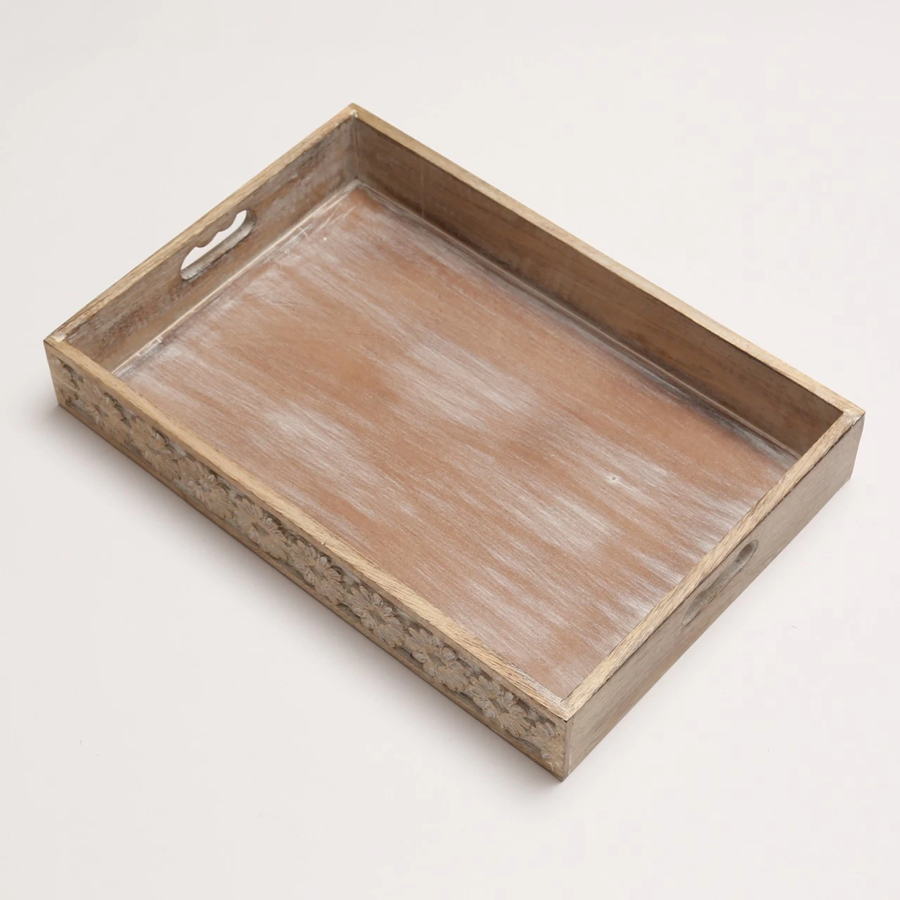 Das naturfarbene Tablett aus Holz mit der Blumenbordüre am längeren Rand, ist genau richtig zum Dekorieren. Kerzen und andere Dekoration sehen auf dem Tablett einfach genial aus.