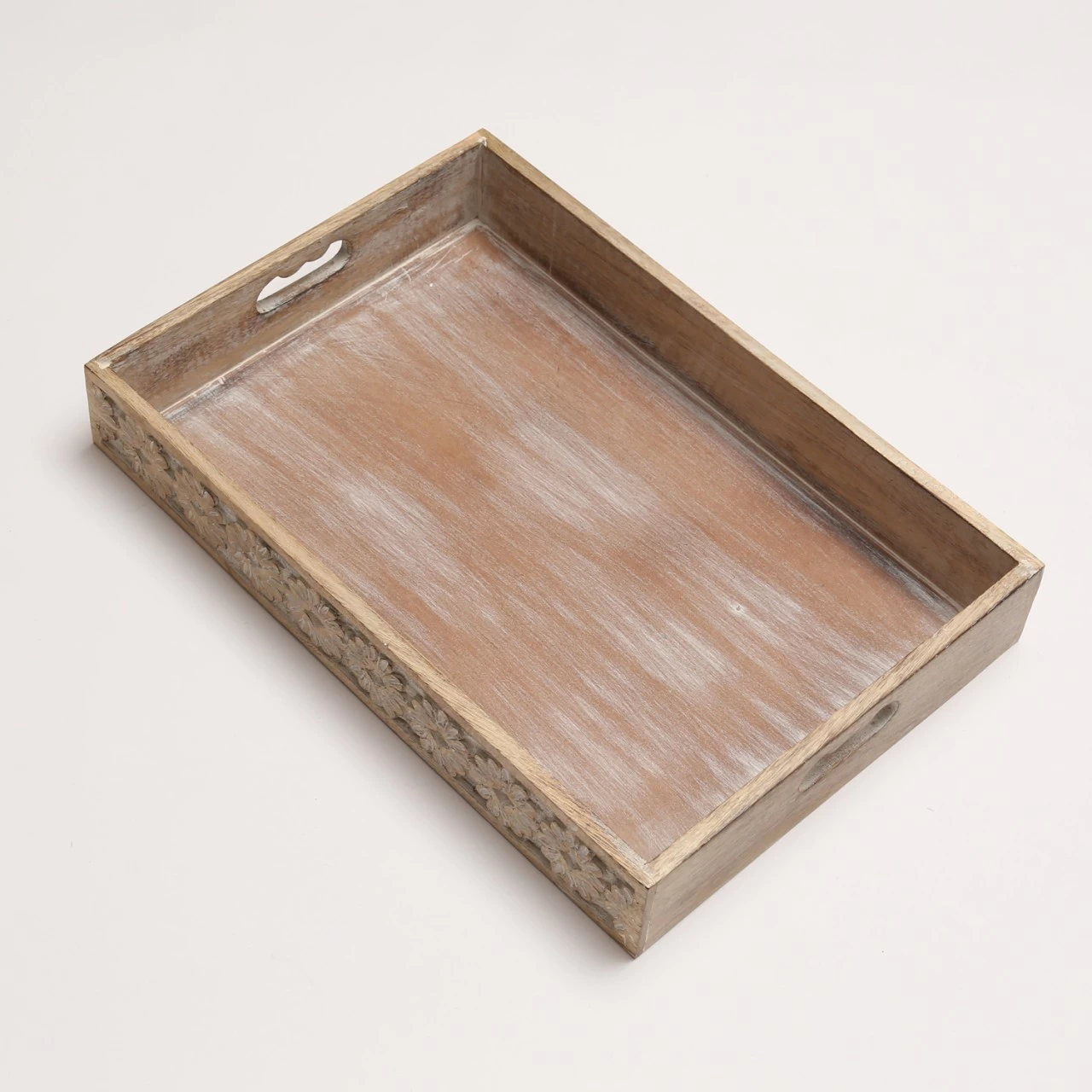 Tablett – Dekotablett – Blumenbordüre – Mangoholz – L: 45cm – B: 30,5cm – weiß gelbeicht